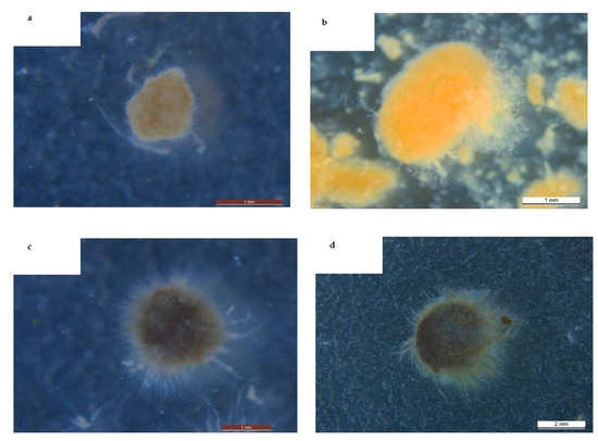 The change in morphology of bacterial AGS before (a) and after (b) the continuous experiment and algal–bacterial AGS before (c) and after (d) the continuous experiment.