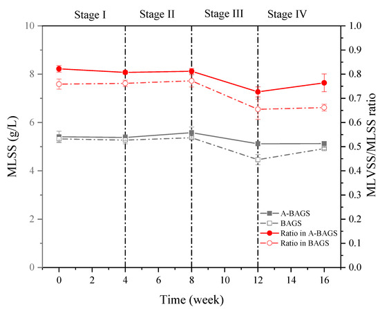 Changes in mixed liquid suspended solids (MLSS and the MLVSS/MLSS ratio) of algal–bacterial AGS and bacterial AGS cultivated at different conditions in the continuous experiment. Stage I, SDS 0 mg/L; Stage II, SDS 10 mg/L; Stage III, SDS 30 mg/L; Stage IV, SDS 0 mg/L; A-BAGS stands for algal–bacterial AGS, and BAGS stands for bacterial AGS.