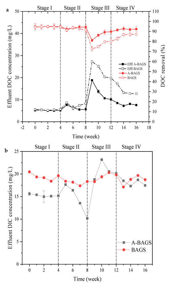 Figure 3 illustrates the changes in DOC and DIC during the exposure experiment. Both algal–bacterial AGS and bacterial AGS maintained a DOC removal rate of more than 93% in the first two stages; however, when the surfactant concentration increased to 30 mg/L, the DOC removal efficiencies of algal–bacterial AGS and bacterial AGS dropped to 81.21 ± 1.2% and 72.69 ± 2.4%, respectively, at the end of the first week, and the effluent concentration reached 18.79 ± 0.12 mg/L and 27.31 ± 0.24 mg/L. After that, the removal rate of both groups began to recover slowly in the following three weeks. By the end of Stage III, the algal–bacterial AGS group reached 89.88 ± 2.2%, which was higher than the value of 80.22 ± 2.7% in the bacterial AGS group, indicating that algal–bacterial AGS could more simply adapt to the harsh environment and return to the normal treatment level [24]. In contrast to DIC, the effluent concentration of the algal–bacterial AGS group was lower than that of the bacterial AGS group under the no surfactant condition. However, when entering Stage II, the effluent concentration of DIC in the algal–bacterial AGS group increased and then gradually decreased. By the end of Stage II, the DIC concentration in the effluent reached 10.18 ± 0.18 mg/L, which was significantly lower than that of the bacterial AGS group. This phenomenon may be attributed to the inhibition of algal cell activity in algal–bacterial AGS after the addition of surfactant, resulting in an increase in DIC effluent concentration; then, the DIC removal efficiency gradually returns to normal levels after adapting to the new environment and even increases to maintain its cell growth under the stimulation of surfactant [25]. When it came to Stage III, the concentration of DIC in the effluent of the algal–bacterial AGS group suddenly increased to 23.17 ± 0.12 mg/L. Although the removal efficiency slowly recovered afterward, it was still unable to return to the initial state, which shows that the destruction of algae cells caused by the surfactant is irreversible [25]. This result may be also associated with the change in chlorophyll-a. As shown in Table 4, the chlorophyll content decreased significantly from Stage II to Stage III (p < 0.05), and, as we know, chlorophyll content is closely related to the growth of algae [26]. Decreased chlorophyll content means decreased DIC utilization. The DIC concentration in the bacterial AGS group was relatively stable compared with the algal–bacterial AGS group, and the effluent concentration was constant at around 19 mg/L. This result also showed that the absorption and utilization of inorganic carbon by algae cells is the main reason for the high removal efficiency of algal–bacterial AGS for DIC [25]. As confirmed by many articles, bicarbonate is the main form of carbon ingested by algae, which facilitates the growth of algal cells and lipid accumulation [26].