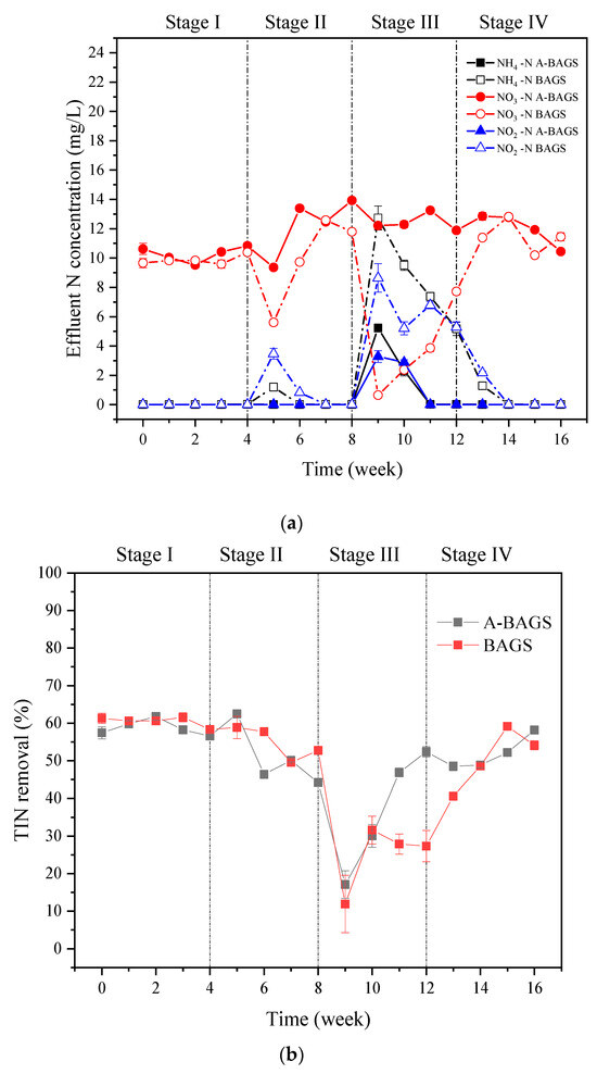 Figure 4 demonstrates the removal efficiency and effluent concentration of TIN between the two groups during the whole process. It shows that without the addition of surfactants, the presence of ammonia nitrogen and nitrite was basically not detected in the effluent of both groups. The main nitrogen component was nitrate, and both systems maintained a TIN removal rate of about 58%. In Stage II, the nitrification process of the bacterial AGS group was inhibited by surfactant interference, and the nitrite concentration in the effluent increased to 3.47 ± 0.36 mg/L. Algal–bacterial AGS maintained a good nitrification ability, but the effluent concentration of nitrate increased by about 23%, indicating that the denitrification process was inhibited. As the surfactant concentration increased, algal–bacterial AGS and bacterial AGS showed obvious differences during Stage III. Although the TIN removal efficiency of algal–bacterial AGS and bacterial AGS decreased rapidly to 17.12 ± 3.68% and 11.92 ± 7.64% in the early stage, algal–bacterial AGS recovered to the initial state after two weeks. On the contrary, the removal efficiency of the bacterial AGS group only reached 27.32 ± 4.16% at the end of Stage III, which was significantly lower than that of the algal–bacterial AGS group (52.36 ± 1.34%) (p < 0.05), and then gradually recovered to normal level in Stage IV. This result indicates that algal–bacterial AGS had better nitrogen removal ability in treating wastewater containing a high concentration of surfactants compared with traditional wastewater treatment methods [27]. Moreover, the assimilation of algae is also one of the reasons for the higher efficiency of nitrogen removal by algal–bacterial AGS [28].