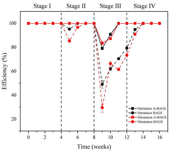 Figure 5 illustrates the nitritation and nitratation efficiencies in both systems, which were calculated according to Li et al. [29]. The results showed that low concentrations of surfactants had little impact on the nitrification processes of the two systems. However, as the surfactant concentration increased, obvious differences between the algal–bacterial AGS group and the bacterial AGS group began to appear. Although the nitratation and nitritation processes were inhibited, algal–bacterial AGS could basically return to normal levels after three weeks, which was significantly better than bacterial AGS. When surfactant addition was removed, bacterial AGS also quickly returned to normal levels in the fourth stage, indicating that the inhibitory effect of SDS on nitrifying bacteria is reversible. Besides that, during Stage III, the decreasing trend in the nitratation rate was significantly more obvious than that of the nitritation rate, suggesting that nitrite-oxidizing bacteria (NOB) is more sensitive to surfactants compared with ammonia oxidation bacteria (AOB), and this result is similar to the results of some previous studies [28].