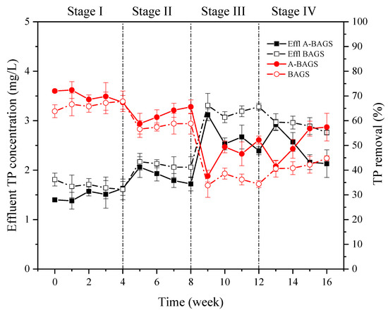 The effluent concentration of phosphorus has always been a key concern of WWTPs. In this experiment, as depicted in Figure 6, during Stage I, both systems were able to achieve a stable removal efficiency of TP of about 66%. Although the removal efficiency of the bacterial AGS group was slightly reduced under the addition of 10 mg/L surfactant, the removal efficiency of algal–bacterial AGS and bacterial AGS were maintained at about 57.4 ± 1.6% and 61.4 ± 3.0%, respectively, which showed no significant difference. After entering Stage III, the TP concentration in the effluent of algal–bacterial AGS and bacterial AGS reached 3.12 ± 0.12 mg/L and 3.31 ± 0.24 mg/L, respectively, and the removal efficiency also decreased significantly to 37.6 ± 2.4% and 33.8 ± 4.8% (p < 0.05). However, by the end of Stage III, the removal efficiency of TP in the algal–bacterial AGS group recovered to 52.2 ± 1.6%. On the contrary, the bacterial AGS group only recovered to 34.4 ± 1.4%. Two reactors continued to show this gap in Stage IV until the end of the experiment, indicating that algal–bacterial AGS could maintain adequate phosphorus removal efficiency even in the face of a high surfactant concentration. Many studies have revealed that algal–bacterial AGS is indeed more effective than bacterial AGS in removing phosphorus [11,30,31,32]. Firstly, the particles formed by the coupling of algae and AGS make PAOs better aggregated. Secondly, the oxygen produced by photosynthesis ensures better aerobic phosphorus uptake by PAOs. Besides that, the previous cycle test also confirmed that the P removal efficiency of algal–bacterial AGS is higher than bacterial AGS [17].