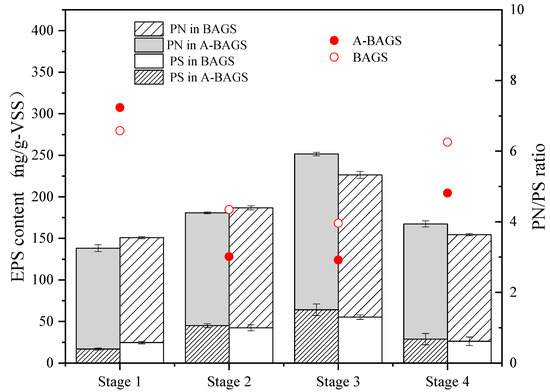 As shown in Figure 7, the total EPS of the algal–bacterial AGS and bacterial AGS groups in Stage I were 138.24 ± 5.2 mg/g-VSS and 150.97 ± 3.1 mg/g-VSS, respectively. The algal–bacterial AGS group showed a slightly lower EPS content than the bacterial AGS group, and the PN/PS ratios of the two groups were 7.3 and 6.6, respectively. When adding a low-concentration surfactant, the PS content of both reactors showed a markable increase (p < 0.05). The PS content in the algal–bacterial AGS and bacterial AGS groups increased from 16.79 ± 1.2 mg/g-VSS to 45.04 ± 2.3 mg/g-VSS and from 24.58 ± 1.5 mg/g-VSS to 42.48 ± 3.7 mg/g-VSS, respectively. In addition, the corresponding PN/PS ratios dropped to 3.01 and 4.35, respectively. This phenomenon was similar to a previous study in which algal–bacterial AGS secreted more PS to ensure mass transfer when encountering changes in the external environment [33]. In addition, PS is one of the main factors that can protect the structure of the cell [34]. The upward trend was still maintained in Stage III, where the total EPS content reached 251.53 ± 6.5 mg/g-VSS and 226.44 ± 3.6 mg/g-VSS, respectively. The EPS content of the algal–bacterial AGS group was higher than that of the bacterial AGS group at this stage. In Stage IV, the EPS in algal–bacterial AGS and bacterial AGS progressively reduced to its initial values. In the whole process, PN was the main composition of EPS, which ensures the formation and stability of algal–bacterial AGS [30]. A previous study also proved that a reduction in PS would reduce sludge bulking, and the decline in settleability and the entanglement of filamentous bacteria around the surfaces of the particles may be related to the large amount of PS secreted by algal–bacterial AGS [35]. In addition, algal EPS acts as a nutrient to promote bacterial growth, while bacterial EPS can reduce adverse effects [36]. These points may be the key reason why algal–bacterial AGS has high resilience when facing high-concentration surfactants and maintains stable removal efficiency.