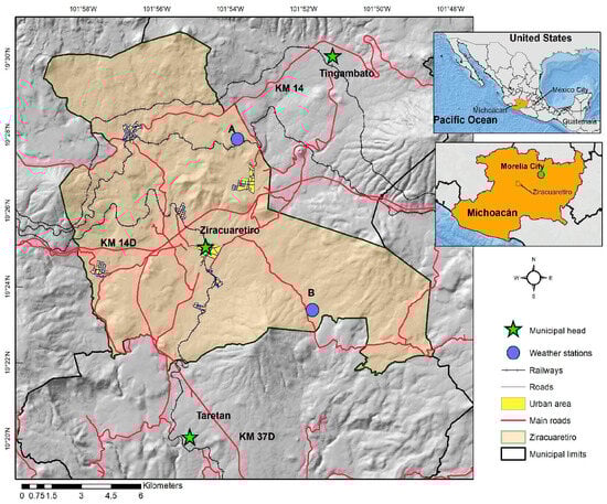 The municipality of Ziracuaretiro is located in the center of the state of Michoacan in the hydrological region of the Balsas River, in central Mexico, between the coordinates 19°21′ and 19°31′ N and 101°48′ and 102°00′ W (Figure 1), with an area of 15,995 ha [35]. It includes altitudes ranging from 1200 to 2400 m.a.s.l.