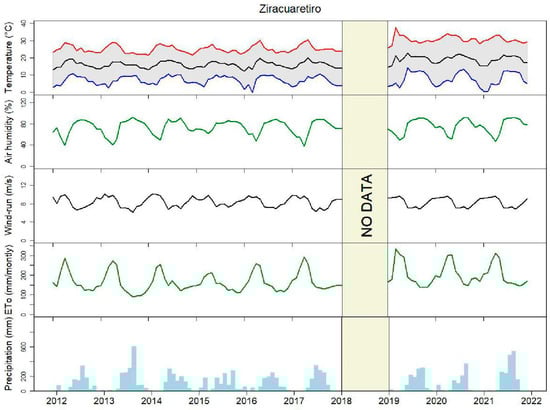 Monthly series of meteorological variables in the municipality of Ziracuaretiro (2012–2021). The 2018 data were omitted from the analysis due to the malfunction of the weather stations. For the temperature (top panel), mean monthly maximum temperature (red), mean monthly temperature (black), mean monthly minimum temperature (blue).