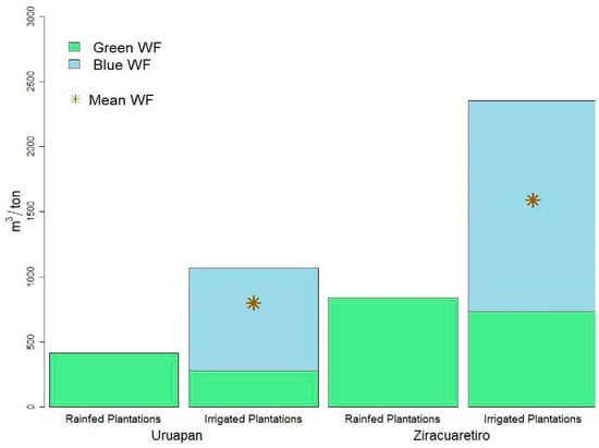 The study of the water footprint of agroindustrial avocado production in the municipality of Ziracuaretiro incorporates two elements for the analysis of water consumption: spatial variation and temporal variation reported by Hoekstra [57] and the phenology of the avocado crop according to Rocha-Arroyo et al. [53,54] are elements that determine the demand for irrigation water for crops [58]. The WF analysis of the municipality studied showed a greater demand for water related to two elements: the phenology of the crop and the existing meteorological conditions in the different phases of the productive cycle. Previous local studies have reported the water required to sustain the avocado crop, between 180 and 652 m3/ton [59], while Gomez-Tagle et al. [15] reported that in one of the main municipalities in avocado production in the avocado strip of Michoacan (Uruapan), the WF for rainfed production was 417.10 m3/ton. It was 1071.40 m3/ton for irrigation, with a total mean WF of 744.30 m3/ton. According to this information, the municipality of Ziracuaretiro would require 50% more water for rainfed production and 54% more for irrigation (Figure 4).