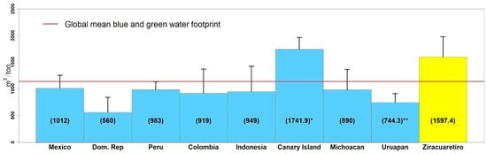 Water footprint studies in the agricultural sector have increased rapidly, and the method has allowed the quantification of the global average water consumption of various fruits, cereals, vegetables, and derivatives. The most relevant study in this is that of Mekonnen and Hoekstra [31], where they estimated the water requirement of more than 126 crops, including corn 1222 m3/ton, wheat 1827 m3/ton, orange 560 m3/ton, and avocado 1981 m3/ton.