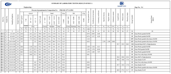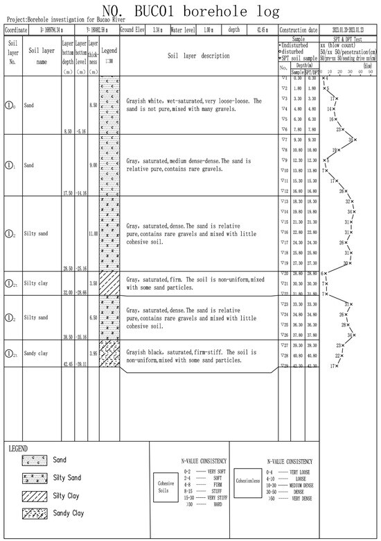 The drilling and stratigraphic data are sourced from the Borehole Factual Report of Bucao River. The overall drilling data are shown in Table 2. According to Table 1, the soil layers under each drilling hole are graded, and the soil distribution of the corresponding soil category is obtained based on the classification criteria. Taking zk1 as an example, the classification of the soil layers at different depths in the drilling hole is mainly based on the standard penetration rate provided in Figure 1, in addition to the d50 data provided in Figure 2, combined with Table 1. In the case of missing d50 data, the soil layers are classified based on the percentage of particle size composition provided in Figure 2 and the soil layer description provided in Figure 1. The final data obtained are shown in Table 1. The distribution data of zk1 formation is shown in Table 3.