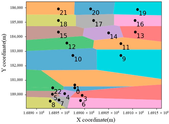 The advantages of the Voronoi diagram partitioning algorithm are as follows: a high algorithm efficiency, a wide adaptability, a simple data structure, and a good visualization effect [14,15,16]. Given the advantages of the Voronoi plot division, it was used for the drilling plane area. By importing drilling data and using the Voronoi plot partitioning algorithm, the planar region partitioning results can be obtained, as shown in the figure, and the partitioning area of each drilling hole can be intuitively obtained from the graph.