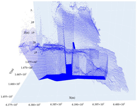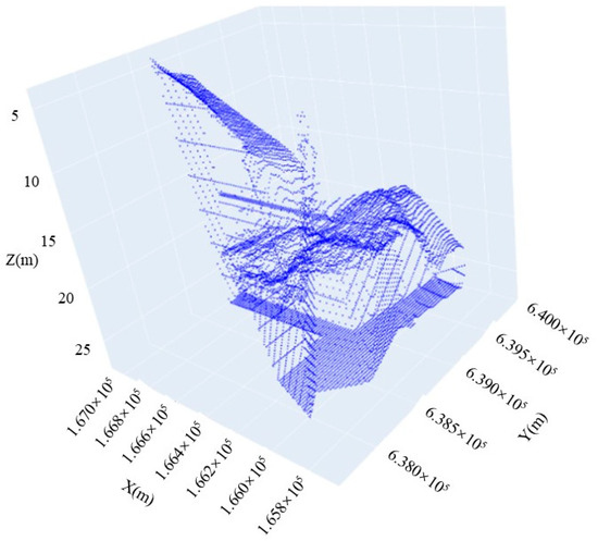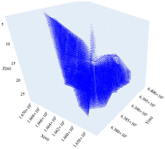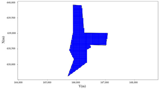 Based on manually provided boundary feature points on the 3D point cloud plane, the ray casting method is used for resampling within the polygon enclosed by these boundary feature points. The resampled plane point cloud generated with a sampling point interval of 64 m is illustrated in Figure 8.