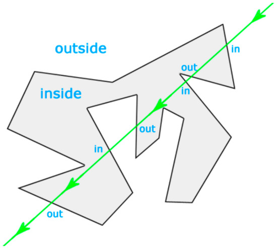 To improve the computational efficiency while ensuring the regularity of the triangulated mesh on the 3D point cloud plane, this paper employs the ray casting method for resampling. The ray casting algorithm [18] is a geometric algorithm used to determine whether or not a point is inside a polygon. It works by emitting a ray from a point outside the polygon and then calculating the number of intersections between the ray and the polygon boundaries to determine whether the point is inside the polygon. The principle diagram of using the ray method to determine a point inside and outside a polygon is shown in Figure 7. If the number of intersections is odd, then the point is inside the polygon; if the number of intersections is even, then the point is outside the polygon.
