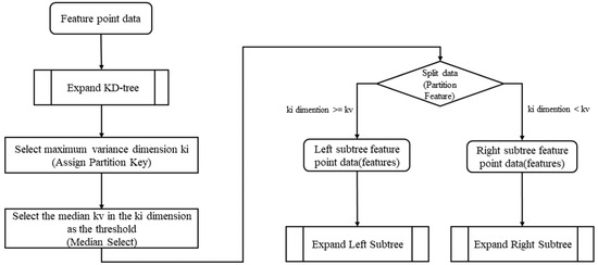 Due to the substantial volume of data in the resampled point cloud, this paper aims to enhance the computational efficiency by employing the KD-tree algorithm based on the known resampling method for the plane point cloud. The KD-tree algorithm is a data structure used to efficiently search for the nearest neighbors in a multi-dimensional space, doing so by recursively partitioning the space, thereby reducing the time complexity of searching and enhancing the search efficiency [19]. The recursive process of the KD tree is shown in Figure 9.