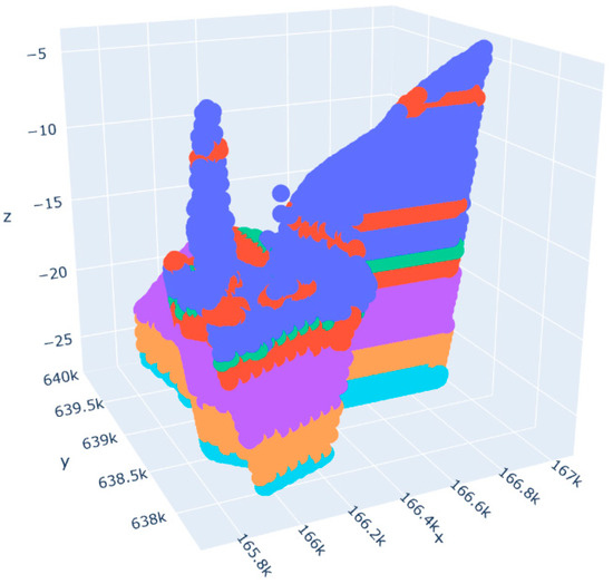 - The planar division of the borehole area is determined using the Voronoi diagram partitioning algorithm (Section 1 of Part III); the high recognition accuracy of the soil state estimation algorithm (more than 95%) is verified using the test dataset, which shows the potential of the algorithm in practical applications. Although the Voronoi diagram partitioning algorithm can achieve a high recognition accuracy, the construction and computation of Voronoi diagrams are still quite complex, especially for large-scale datasets. The order of magnitude of the point cloud model starts from 1 × 105, and the calculation degree is quite complex.