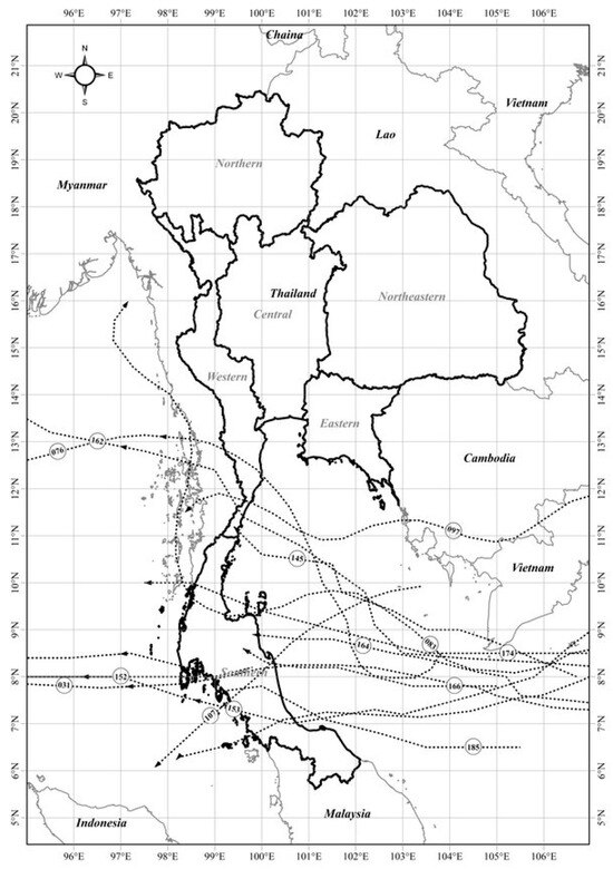 The storm transposition method recommended by the World Meteorological Organization [10] was considered for use in this study. The study entailed an examination of historical and current rainfall data in Thailand. In this study, the rainfall data obtained from the Thai Meteorological Department [11] were examined for a period of 65 years, ranging from 1951 to 2015, which included a total of 190 storms. The study area, which was the watershed of the Kaeng Krachan Dam, specifically focused on large-scale storms that occurred in the same geographical region. The selection process was conducted by considering the highest recorded rainfall levels throughout a 3-day timeframe. These data were then compared with the actual recorded rainfall data to determine the rainfall quantities for each storm, which varied from 1 to 3 days. The information regarding the storms and the weather stations that contributed to the highest amount of rainfall can be found in Table 1. The 10 highest rainstorms of the 14 that influenced the west and south of Thailand were then carefully selected. The storm tracking map is shown in Figure 2.