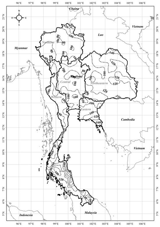 The adjustment index accounts for the topography, as Thailand predominantly features a flat environment with minimal slope requirements. This investigation specifically examines how geographical changes impact the behavior of storms, utilizing the adjustment percentage of annual or seasonal rainfall, known as HMR46 [12]. The average seasonal rainfall and number of rainy days per season in the southern part of Thailand from October to December were calculated using monthly average rainfall data and the number of rainy days from 654 rain gauge stations across Thailand for the years 1951–2009 [13]. The investigation utilized GIS software (ArcGIS 10.5) to produce maps that depict the adjustment index resulting from the terrain, as depicted in Figure 3.