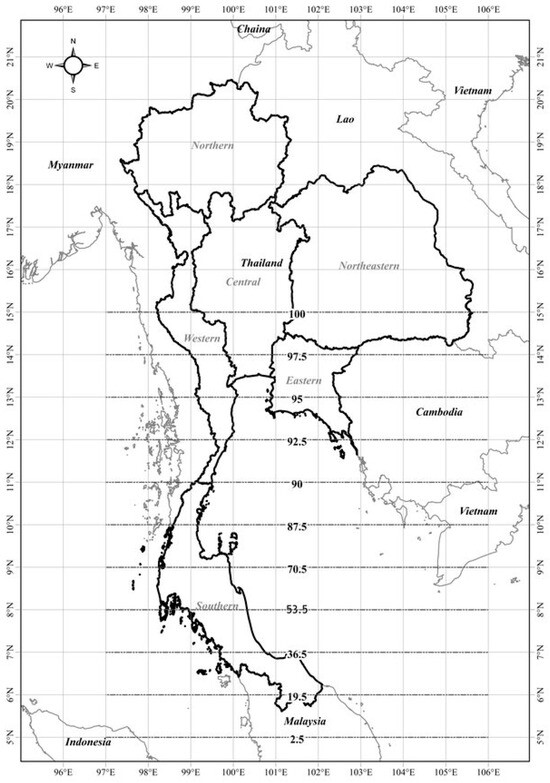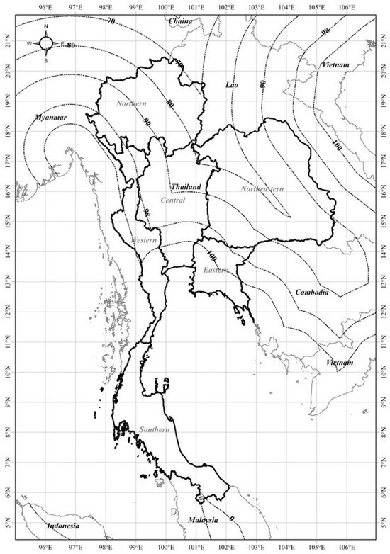 - Maneesarn, W. Topography and Seasonal Weather of Each Region in Thailand; Academic Document No. 551.582-02-2538; U.S. Department of the Interior Bureau of Reclamation: Washington, DC, USA, 1995; ISBN 974-7567-25-3. (In Thai)