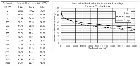 This study applied the areal rainfall reduction factor (ARF) for the reduction of rainfall amount, which depends on area size. The first ten strongest storms that occurred in the south of Thailand were used for the calculation. The different rainfall loss rate factors related to various return periods suggested by [16] were used. Figure 6 presents areal rainfall reduction factors for the southern part of the country.