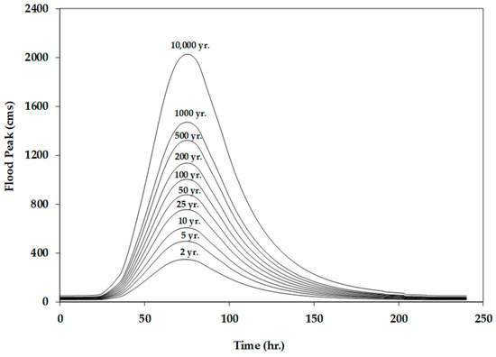 Fourteen rainstorm events were considered in order to estimate PMP in the Kaeng Krachan catchment. Table 5 indicates the highest cumulative rainfall period for three days using observed data and the results of the storm transposition method. The highest PMP occurred from 31 October 31 to 4 November 1969 for a tropical depression (storm code: 076) with a rainfall amount of between 429.20 and 726.40 mm for three days. Slight differences of maximum rainfalls between observed/calculated data could be noticeable, with 429.20/513.90, 603.10/722.12, and 726.40/869.76 mm for the first, second and third days, respectively. In addition, the observation of maximum floods calculated by storm events at different return periods and probable maximum floods are presented in Table 6 and Figure 7 and Figure 8. Probable maximum flood and base flow were 4677.00 and 86.80 cms, respectively, whereas flood volume was 1057.60 mcm.