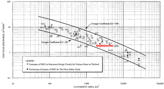 Comparing the assessment of the PMF for the Kaeng Krachan Dam to the previous study, it was found that the PMF value obtained in this study closely matches the PMF value determined in the historical study. Furthermore, by dividing the PMF value derived from this study by the area that received rainfall, the unit peak discharge was then computed. This may then be graphed to illustrate the correlation between unit peak discharge and rainfall receiving area. The graph was constructed using probability mass function data obtained from 43 dam projects in Thailand, as documented by the Food and Agriculture Organization (FAO) [21]. Figure 9 unequivocally illustrates that the PMF value obtained from this research is within a rational range and aligns with findings from prior investigations.