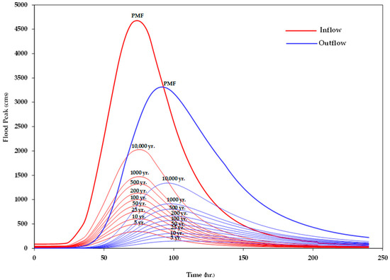 The analysis of the movement of the maximum diversity graph during annual occurrences and the PMF graph through the spillway is shown in Table 8, based on the study results. Figure 10 illustrates a comparison between the graphs depicting the highest levels of diversity in the inflow and outflow of water through the spillway of the dam. It was observed that, within a recurrence period of 2 to 10,000 years, the highest range of water levels with the most diversity was between +99.70 and +102.10 m (msl). The current level exceeded the spillway crest level, with a range of 0.70 to 3.10 m. However, it still maintained a safe distance from the highest water level to the dam crest (dry freeboard), which was between 3.90 and 6.30 m. The maximum diversity water level was not above the predetermined maximum water level of +102.65 m (msl).