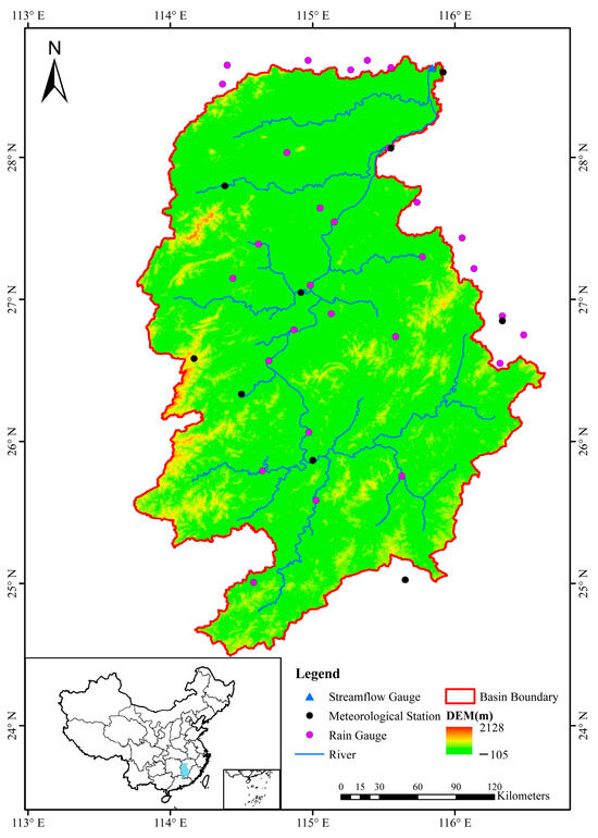 The Ganjiang River, spanning a main river length of 823 km, is the largest river in Jiangxi province of China and also one of the eight major tributaries of the Yangtze River. The Ganjiang River Basin (GRB), located between 113°30′ and 116°40′ E and 24°29′ and 29°21′ N, encompasses a total area of 80,948 km2 above the Waizhou hydrological station, accounting for approximately 48.5% of the area of Jiangxi province (Figure 1). The topography exhibits diversity, ranging from hills in the southern region to alluvial plains in the northeastern region; mountains constitute around 50%, hills account for about 30%, and plains make up roughly 20%. Elevation varies between −105 and 2128 m above sea level. Annual precipitation in this basin amounts to an average of 1626.8 mm with an annual average evaporation rate of approximately 1550 mm. The average temperature is about 18 °C. Summer is the warmest season, accompanied by heavy rainfall, the plum rain precipitation is the most concentrated from April to June, and typhoon-type heavy rainfall occurs from July to September, resulting in significant seasonal variations in streamflow.