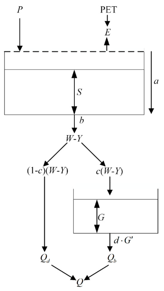 In order to analyze the influence of model choice on runoff attribution analysis, three hydrological models with different complexities and temporal scales, are selected to simulate streamflow. The GR1A model is an annual-scale hydrological model with a simple structure, the ABCD model is a monthly scale hydrological model with a more complex structure, while the DTVGM model is a daily scale hydrological model with the most complex structure. Additionally, the first two models are lumped hydrological models, while the DTVGM is a distributed hydrological model. A detailed description of these three models is given as follows.