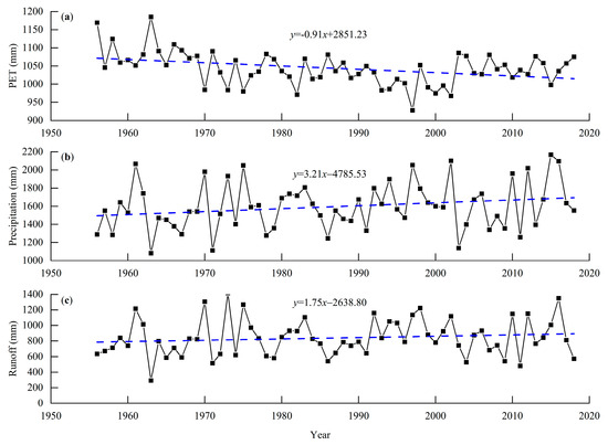 The time series of hydro-climatic variables in Ganjiang River Basin ((a) potential evapotranspiration; (b) precipitation; (c) runoff). The black square lines are observed values, and the best-fit lines estimated by the OLS (ordinary least square) method are the blue dotted lines.