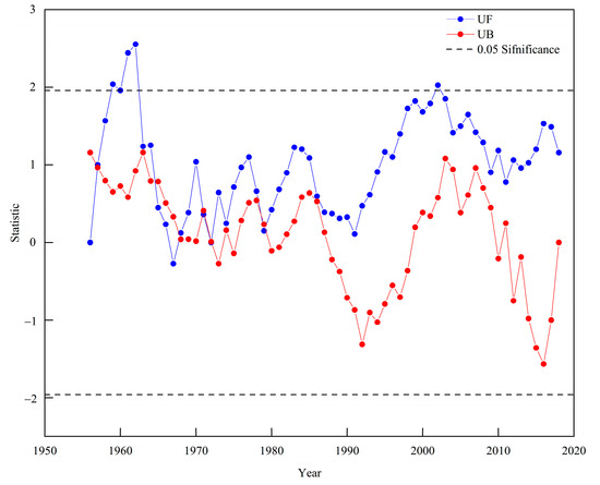 As shown in Figure 4, the M-K mutation test exhibited more than one mutation point, and the moving-T test was used to divide the reference period and the changed period. Consequently, the GRB changed abruptly in the year of 1968; a similar result was obtained by using the standard normal homogeneity test (SNHT) and other studies by Lei et al. [45], Fan et al. [46] and Zhang et al. [47]. Taking 1968 as the critical time point, the whole sequence is divided into the reference period (1956–1968) and the changed period (1969–2018), and the influence of climate change and human activities on runoff is quantitatively analyzed (Table 3). Compared with the reference period, the annual potential evapotranspiration in the changed period decreased by 5.64%, while the annual precipitation and annual runoff increased by 9.24% and 16.66%, respectively.