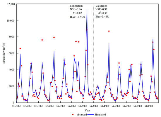 When using ABCD and DTVGM models for runoff simulations, the reference period was divided into two periods: calibration (1956–1962) and validation (1963–1968) periods. The SCE-UA algorithm was used to calibrate the ABCD model with NSE and R2 as the objective functions, and the optimized parameter values were a = 0.94, b = 548.42, c = 0.16 and d = 0.34. Table 4 lists the simulation accuracy evaluation of the ABCD model in the calibration and validation periods, and Figure 6 shows the monthly runoff simulated by the ABCD model. The ABCD model obtained NSE of 0.86 and 0.92, R2 of 0.87 and 0.92, and Bias of −1.96% and 3.44% in the calibration and validation periods, respectively. The strong agreement between the simulated and observed monthly runoff during both calibration and validation periods, as shown in Figure 6, indicates that the ABCD model was highly effective in simulating monthly runoff in the GRB.