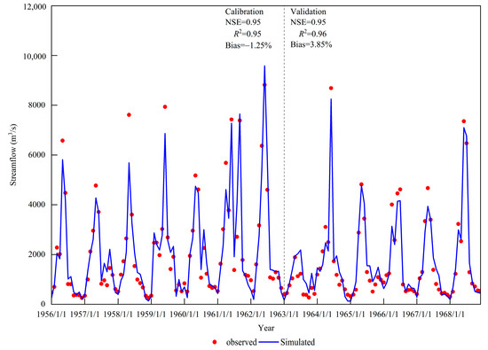 This study employed three hydrological models, each characterized by distinct temporal scales and complexities. Due to the limited duration of the annual precipitation, potential evapotranspiration, and runoff series in the reference period (1956–1968), the entire hydro-meteorological datasets for that period were employed for parameter calibration in the GR1A model. Utilizing the SCE-UA optimization algorithm [48], the parameter of the GR1A model was calibrated, resulting in an optimized parameter X of 0.79. Figure 5 shows the simulated and observed annual runoff processes for the reference period (1956–1968), demonstrating a general agreement. The NSE and R2 values of the GR1A model were both 0.83, and the Bias was 1.76%. The simulation results demonstrated the applicability of the GR1A model for simulating runoff variations in the GRB.