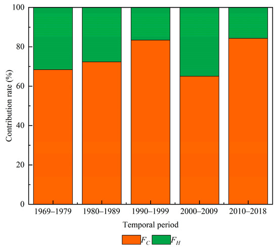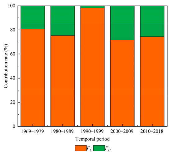 Then, the changed period was divided into five decades, including 1969–1979, 1980–1989, 1990–1999, 2000–2009, 2010–2018, and the contribution rates of climate change and human activities in each decade were estimated in Table 7 and Figure 8. For the whole changed period, the contribution rates estimated by four different Budyko formulas were almost the same, with the average contribution rate of climate change and human activities 80.17% and 19.83%, respectively. Among the five decades, the contribution rate of climate change during 1990–1999 was the highest, with a value of 98.25%, while the values of other decades were around 70–80%. Based on the climate elastic coefficient method, climate change was the main factor affecting runoff change in the GRB.