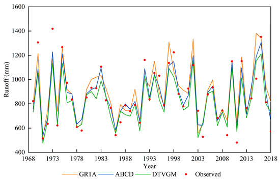 The runoff process of the changed period was simulated by using the calibrated GR1A, ABCD and DTVGM models, as shown in Figure 9. The three model evaluation indices for assessing the applicability of three hydrological models are shown in Table 8. Compared with the reference period, GR1A and DTVGM models had a relatively worse performance with a lower NSE and R2, while ABCD models showed the same performance with an NSE of 0.91 and R2 of 0.92. These values of the three hydrological models were all within a reasonable range and reached a satisfactory level based on Moriasi et al. [38].