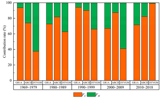 The contribution rates of climate change and human activities estimated by different hydrological models are shown in Figure 11. The contribution rate of each factor estimated by the three hydrological models was significantly different. Among three hydrological models, the GR1A model identified 1969–1979 and 1990–1999 as the most sensitive periods to climate change, with contribution rates larger than 90%, while the ABCD model determined that 1990–1999 and 2000–2009 were more sensitive to climate change, with contribution rates of 90.09% and 87.31%. In contrast, the DTVGM model tended to overestimate the contribution rate of human activities. The influence of human activities was more prominent in the periods of 1969–1979 and 2000–2009, with contribution rates of 62.38% and 59.11%, while climate change was most significant in 2010–2018, with a contribution rate as high as 99.19%.