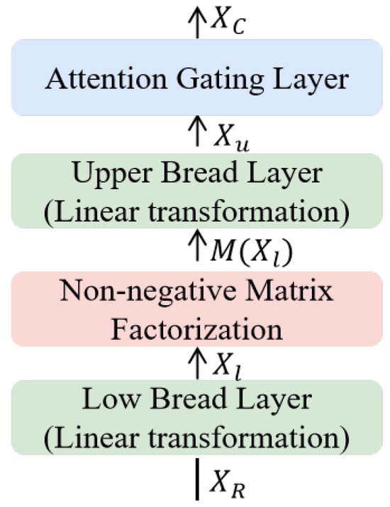 Channel features refer to the correlations between different variables or input dimensions in multivariate time series data. The module of channel feature extraction is shown in Figure 4, consisting of a “Hamburger” structure and an attention gate layer. The “Hamburger” structure consists of two “bread” parts and one “ham” part []. The “bread” parts use simple linear layers for feature mapping. The lower “bread” can project the input data into a higher-dimensional space, helping to introduce more detailed features. The upper “bread” is used for dimensionality reduction and capturing the “essence” of the data, which are therefore less prone to overfitting. Additionally, the “ham” part uses non-negative matrix factorization (NMF) for channel feature extraction. In neural networks, NMF represents the original data matrix as the product of basis feature vectors and weight coefficient matrices, thereby extracting and representing features of the data, which can help the network learn latent patterns or feature representations in the data. The process of the channel feature extraction of input data through the “Hamburger” structure can be described by the following formula: