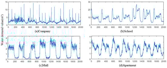 The experimental data in this paper were derived from the historical water demand dataset of a real-world water distribution system. As shown in Table 1, they are from four different types of areas, including commercial centers, universities, large malls, and residential areas, named as Company, School, Mall, and Apartment, respectively. Each dataset consists of seven channels of data, with each channel representing the flow data collected from flow sensors at different locations. The sampling interval is 5 min, and the time span is 1 year, totaling 105,120 water demand data points. In Figure 5, the waveform characteristics of the four datasets are distinctly represented. The Company dataset primarily exhibits a moderate oscillation with sporadic pulse-like waveforms, signaling abrupt alterations. The School dataset demonstrates a higher amplitude of fluctuation, accompanied by notable nonlinear attributes. The Mall dataset exhibits strong periodicity with waveforms akin to a square wave, yet it shows some fluctuation at the peak magnitudes. The Apartment dataset has a general periodic pattern, but it is subject to sharp variations within a single cycle’s duration. One month of data, totaling 8640 data points, was extracted for experimentation to validate the model’s performance under small sample sizes. The datasets were partitioned into three distinct subsets: a training set, a verification set, and a test set, following the ratio of 7:1:2, respectively. The linear interpolation method was used to process missing data: