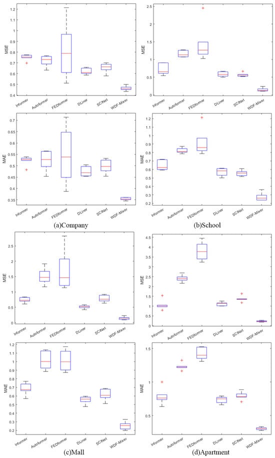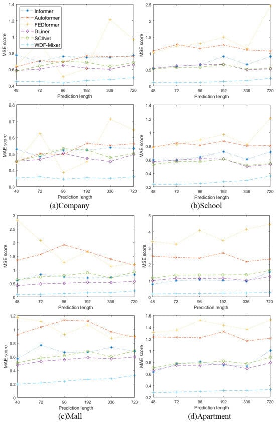 The experimental results presented in Table 2 illustrate that the proposed WDF-mixer model achieved the optimal predictive performance on the small-scale datasets, whereas DLinear and SCInet exhibited suboptimal predictive performance at varying forecasting lengths. Despite DLiner and SCINet’s relatively accurate predictions for the majority of data points, indicated by lower MSE and MAE scores, the impact of a small number of data points with larger errors is evident in the diminished score. SCInet utilized a recursive downsampling technique to decompose sequences for interactive learning, thereby enhancing the time series data and yielding satisfactory predictive outcomes. Meanwhile, DLinear decomposed time series into trend and residual components, employing two simplistic linear networks for modeling, also achieving satisfactory predictive performance. A comparative analysis of the methodological principles between the SCInet and DLinear models allowed us to derive the following conclusions [,]: (1) Decomposing sequences to address the low-rank characteristics of time series data can, to a certain extent, extract crucial features, facilitating easier modeling and representation of the data. (2) Due to the inherent low-rank nature of time series, decomposed sequences require only simple feature extraction methods to extract crucial information, resulting in favorable forecasting outcomes. These experimental observations further underscore the scientific rigor and effectiveness of the proposed time feature extraction module within the WDF-mixer framework. Notably, when contrasted with previous state-of-the-art outcomes, WDF-mixer achieved an average mean squared error (MSE) reduction of 25.02% in the Company dataset, 73.41% in the School dataset, 72.48% in the Mall dataset, and 79.53% in the Apartment dataset.