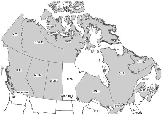According to Indigenous Services Canada [61], there are 63 First Nation bands in Manitoba with approximately 163,000 registered members across five different linguistic groups. The population of First Nation members between the northern and southern regions is not precisely known, but estimates based on representation in the primary tribal organizations suggest that there are slightly more First Nation people in the south than the north [62]. Not all First Nation people are members of reserves. With treaties, lands were set aside for First Nation people. Approximately half of the registered members live on-reserve, though this does not mean that members living off-reserve do not participate in the cultural practices or social activities of their communities. A map of reserve land is shown in Figure 3.