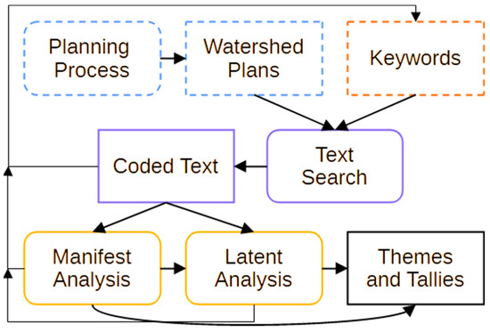 This study uses content analysis of watershed plans to describe Indigenous engagement in Manitoba’s water governance and watershed planning processes. Examining the documents that structure and serve as a record of engagements between Indigenous peoples and the state, such as policies, legislation, and resource management plans, can give insight into the opportunities, barriers, and contexts of engagement [65,66]. We consider watershed planning as a subset of water governance institutions, practices, and processes. As outputs of the planning process, watershed plans are our objects of content analysis. We identify and count how often Indigenous-related keywords occur in Manitoba’s watershed plans, and then we thematically code the keywords according to their apparent and contextual use in the document. A diagram representing the process is shown in Figure 3.