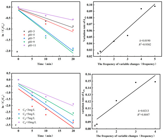 As shown in Figure 11a–d, the rates of change in pH and initial concentration of ciprofloxacin in kobs were 0.0190 and 0.0213, respectively, over 20 min, with little difference. This suggests that the pH and initial ciprofloxacin concentration have similar effects on the reaction during this time. However, as shown in Figure 11, the degradation rate stabilized at 20 min for different initial concentrations of ciprofloxacin, the degradation rate exceeded 80%, and the maximum difference in degradation rate between different initial concentrations of ciprofloxacin was approximately 10%. However, the results in Figure 11 show that under the influence of different pH values, the degradation rates at different pH values are still quite different after 20 min, and the maximum difference in the degradation rates at different pH values can reach approximately 40%.