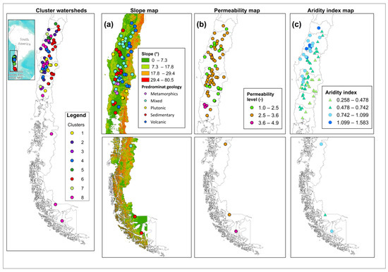 Figure 2 shows boxplots with the hydrogeological, morphological, and climate characteristics of the basins for the 8 clusters obtained by Parra et al. [28] (mean elevation, mean slope, degree of permeability, and aridity index). The basins that compose clusters C1 and C6 are located in the Andes Mountains and foothills, with mean elevations ranging from 650 to 1900 m.a.s.l., slopes over 13°, and medium to high permeability (volcanic, plutonic, and mixed geological formations) (see Figure 2a–c). Meanwhile, C3 and C5 are composed of basins monitored in the Central Valley, with mean elevations below 600 m.a.s.l., slopes between 0.7 and 7°, and variable permeability (low, medium, and high) (see Figure 2a–c). Clusters C2, C4, and C8 are composed of a broad group of basins monitored in the Central Valley and Coastal Range (heterogenous clusters). Finally, cluster C7 is composed of basins monitored in the Coastal Range, with mean elevations between 200 and 800 m.a.s.l., slopes between 4 and 11° (Figure 2a,b) and medium-low permeability associated with sedimentary to mixed characteristics.