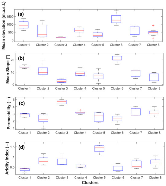 Cluster characteristics. The mean elevation (a), mean slope (b), degree of permeability (c), and aridity index (d) of each cluster are also shown.