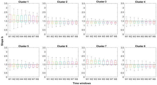 Figure 3 shows the results (box-plots) obtained from the recession flow analysis, along with a comparison of results for each time window and cluster, while Figure 4 presents the median slope b obtained from the analysis of each time window.