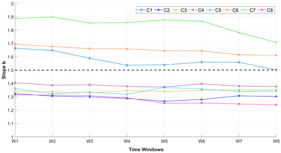 Median slope b values of each cluster obtained from the different time windows. The dashed line represents the limit value of b for fast drainage (b > 1.5) and slow drainage processes (b < 1.5). w1, w2, w3, w4, w5, w6, w7, and w8 correspond to moving windows of 2 years, 3 years, 4 years, 5 years, 10 years, 15 years, 20 years, and 25 years, respectively.