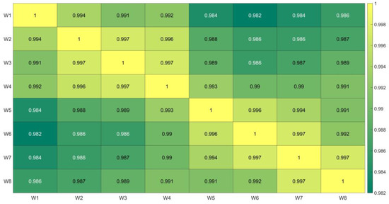 The correlation matrix between each watershed’s median slope b values from the 8 time windows.