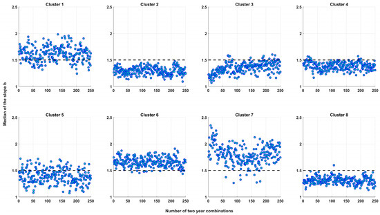 To further analyze if a two-year time window is enough for watershed hydrogeological characterization, the median slope b obtained from 250 aleatoric combinations of two years (non-consecutive) of streamflow recession was plotted (Figure 6). The median was calculated using the slope b values of the watersheds that comprise the cluster obtained from each aleatoric combination of two years. Figure 6 shows that in over 95% of the results, the median hydrogeological behavior for clusters C2, C3, C4, C6, and C8 can be properly obtained from two years of records. On the other hand, it is also observed that clusters C1, C5, and C7, mainly basins with fractured and granitic geology, would need more data records to estimate the hydrogeological behavior of the watersheds.