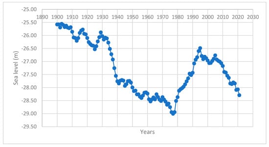 Changes in the annual average water level of the Caspian Sea during the period of 1900–2021 observations, according to the data of Mahachcala hydrological station (Russia).