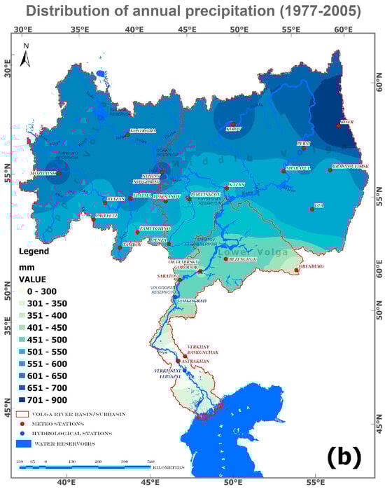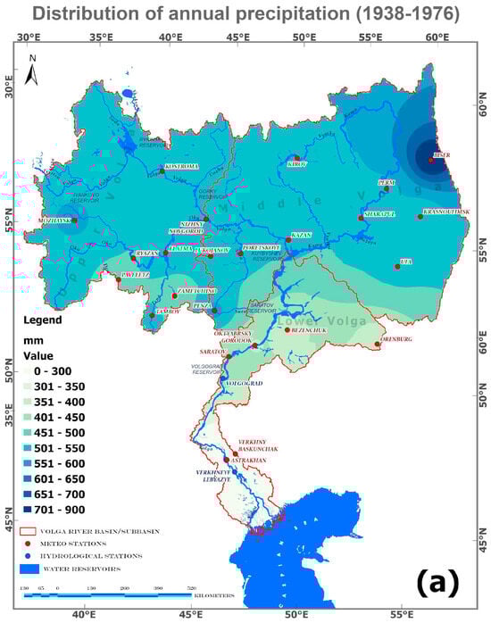 As is known, the annual runoff of the Volga River is directly related to the amount of precipitation falling into its basin. Therefore, to begin with, the nature of a possible connection between them was investigated. For this purpose, we used runoff data from the hydrological station Verkhneye Lebyazhie, which is located at the nearest distance from the Volga delta (Figure 1), and precipitation data from 24 meteorological stations located in different parts of the river basin. Figure 4a–c show the distribution of annual precipitation over the Volga River basin for various periods of rising and falling levels of the Caspian Sea.