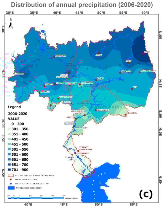 Distribution of annual precipitation over the Volga River basin for various periods: (a) 1938–1976; (b) 1977–2005; (c) 2006–2020.