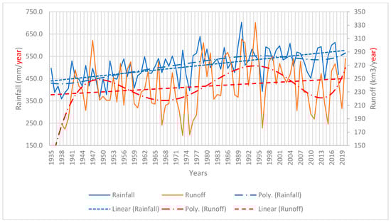 As can be seen from Figure 6, the annual precipitation averaged over the basin area has a statistically significant upward trend during the period under consideration. Annual runoff also has a slight upward trend, but it is not statistically significant. Because at the considered significance level (0.05), condition (2) is not satisfied (Table 1).