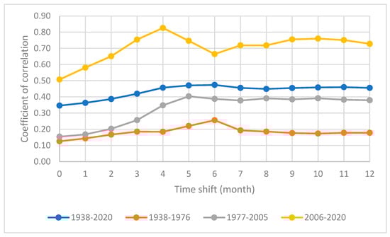 Further calculations with a time resolution of 1 month showed that the greatest correlation between annual precipitation and runoff is observed when the second is shifted 4–6 months ahead. At the same time, the maximum shift (6 months) was observed in the period 1938–1976 and the minimum (4 months) in 2006–2020, which can be explained by climate warming.